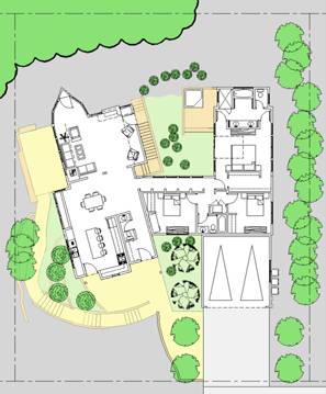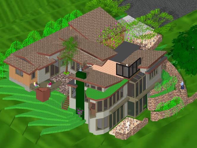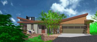 The building features two wings, a living area to the west, angled to maximize solar heating while taking advantage of the views, and a bedroom wing to the east, which aligns with the street. An intimate, private courtyard between the wings provides protection from occasional ocean winds. |